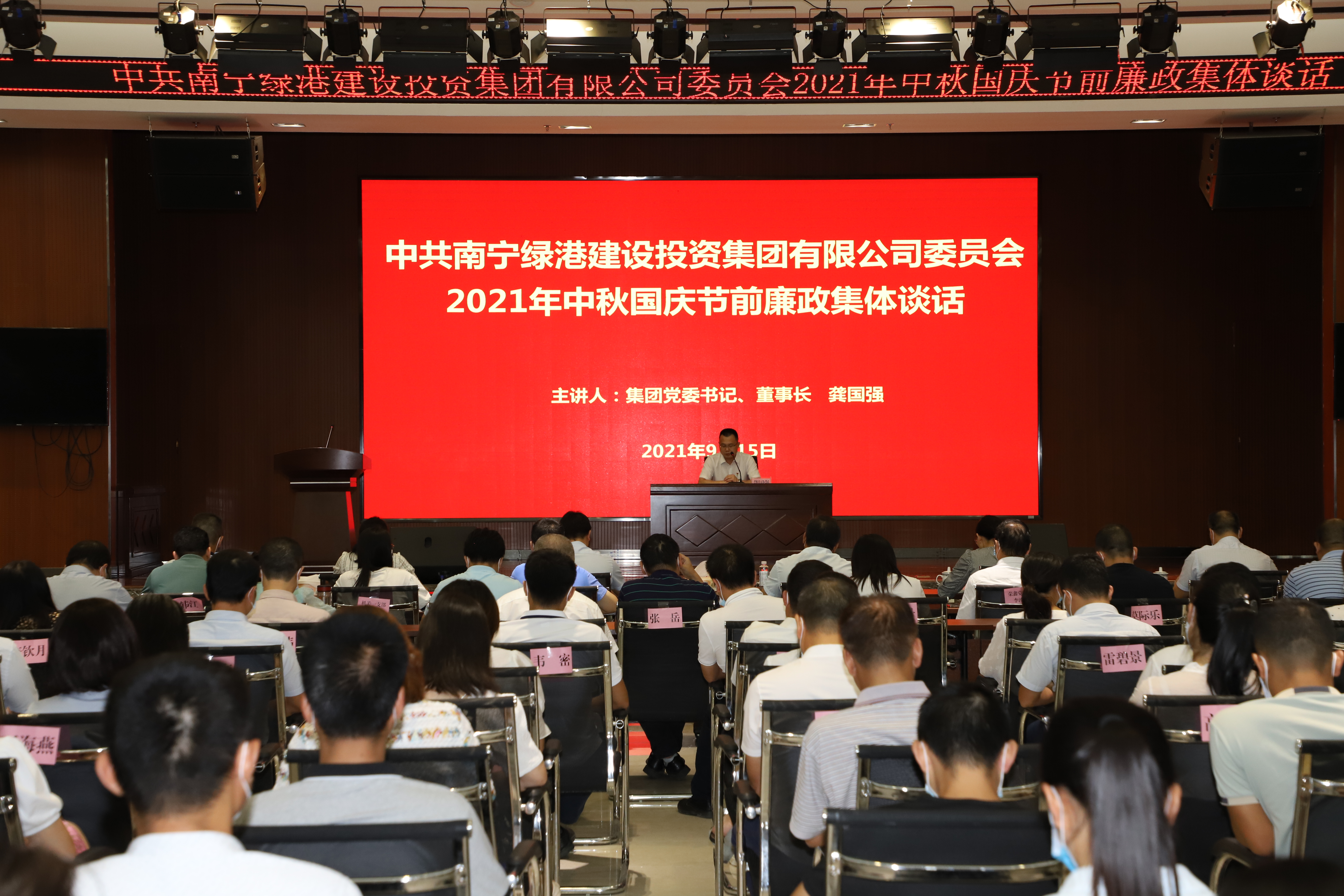 近日,綠港集團黨委組織召開2021年中秋國慶節(jié)前廉政集體談話會。集團黨委書記、董事長龔國強出席會議并作廉政集體談話。集團領導班子全體成員、集團各部門及各子公司中層副職以上人員參加會議。